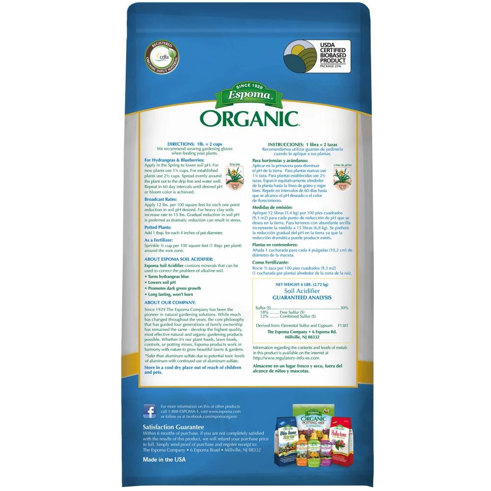 Espoma organic traditions 6 lb. garden sulfur soil Acidifier is an all-natural mineral that can be used to lower the pH of your soil or to provide plants with sulfur, a nutrient that promotes growth and dark greening. It will also turn hydrangeas from pink to blue.