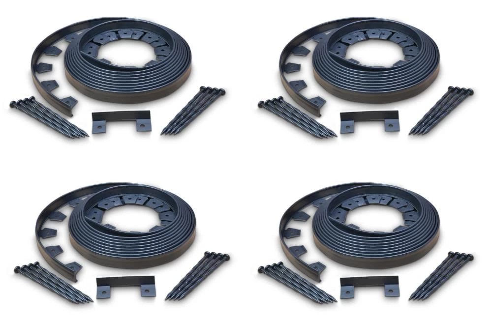 - Pack contains (4) 30 ft. coils (120 total ft.) of landscape edging, 32 anchoring spikes, and 4 connectors